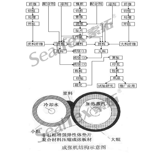 抄取工藝是一種類(lèi)似造紙工藝的方法,當(dāng)初是在美國(guó)研發(fā)成功,用以生產(chǎn)石棉密封材料。美國(guó)的阿姆斯壯 Armstrong World Industry于80 年代研發(fā)成取代石棉的無(wú)石棉密封材料后,便一直使用抄取工藝而成為全球軟墊片材料的供應(yīng)商。用抄取工藝生產(chǎn)無(wú)石棉墊片材料在中國(guó)還是個(gè)新興工藝。在國(guó)內(nèi)的墊片材料的供應(yīng)商中,不到 10 家公司能成功生產(chǎn)真正不含石棉的無(wú)石棉墊片材料。下圖顯示的是生產(chǎn)無(wú)石棉墊片材料使用的抄取法工藝流程: